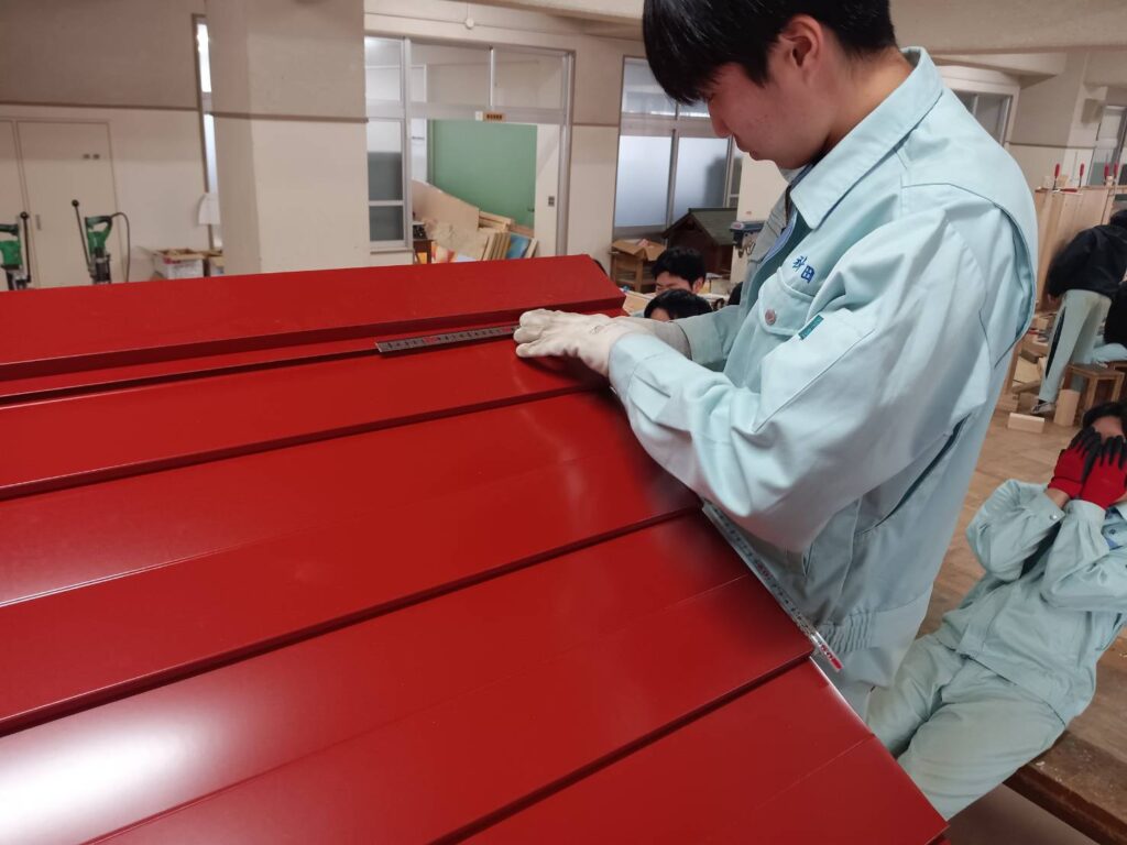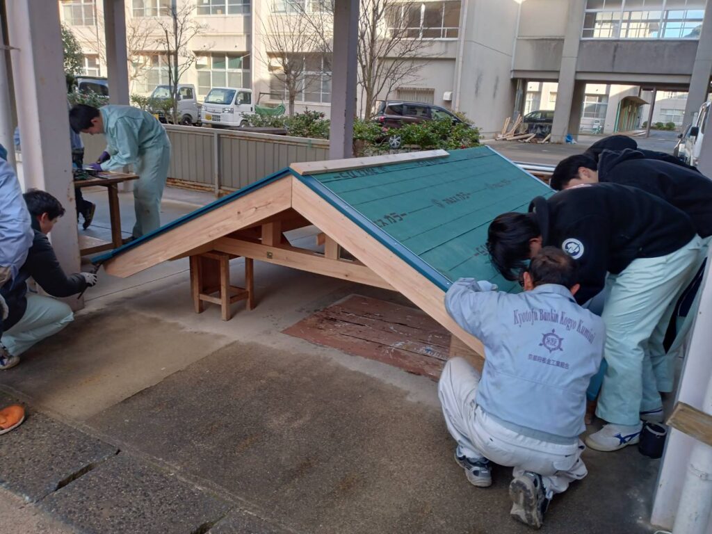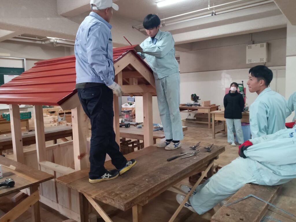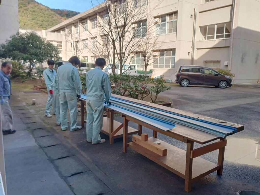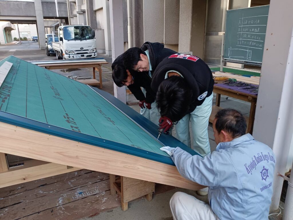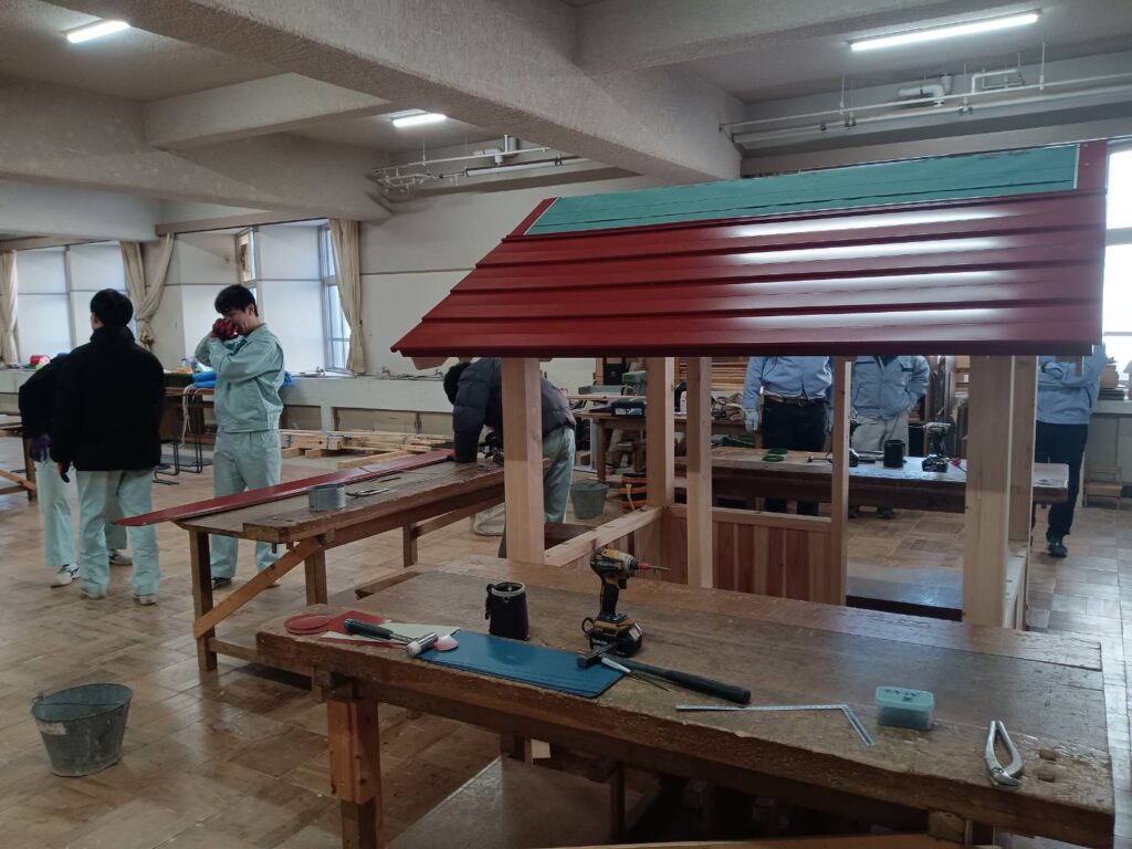 令和7年(2025年)12月10日(水)・11日(木)京都府立宮津天橋高等学校 宮津学舎に於いて当組合のものづくりマイスター及び組合員(6名)が受講生の生徒(男性女性合わせて2日間で合計25人程度)に指導を行い、幼稚園等に寄贈する小屋(ままごとハウス、バス停屋根)に金属屋根葺きを行う派遣出張の板金講習を実施いたしました。