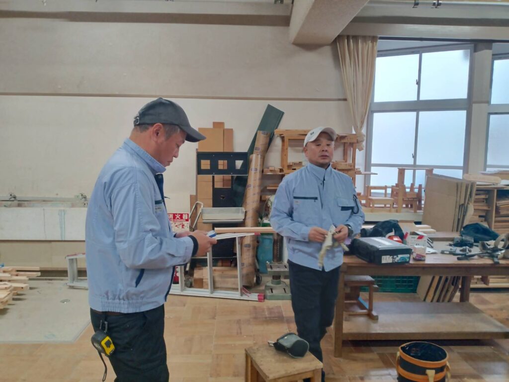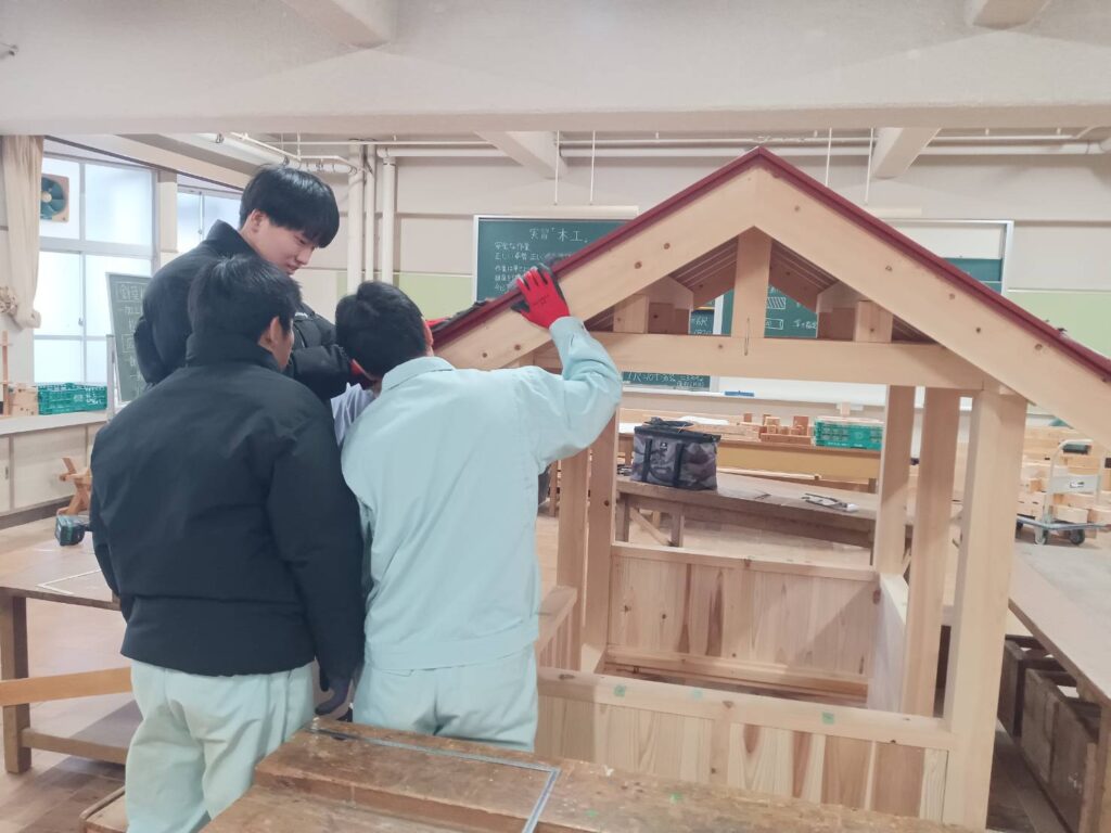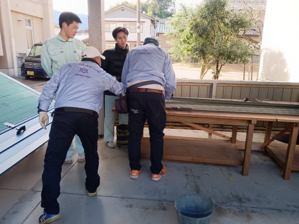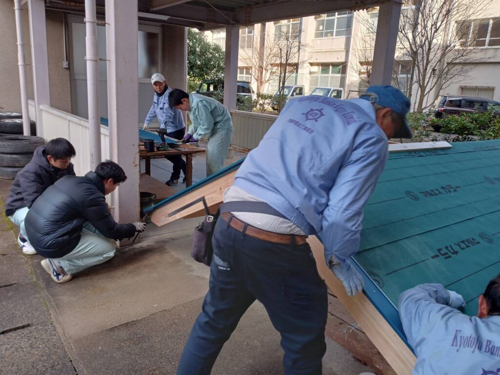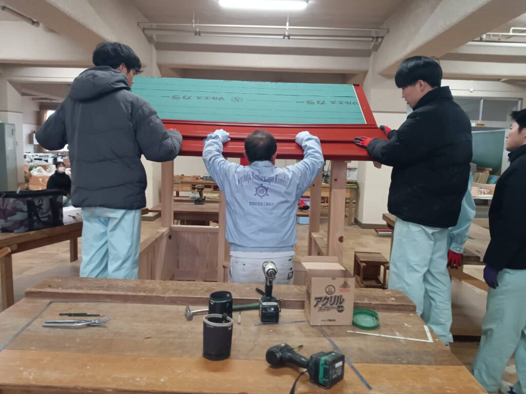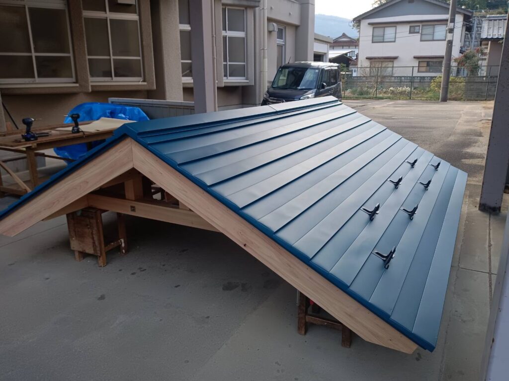 令和7年(2025年)12月10日(水)・11日(木)京都府立宮津天橋高等学校 宮津学舎に於いて当組合のものづくりマイスター及び組合員(6名)が受講生の生徒(男性女性合わせて2日間で合計25人程度)に指導を行い、幼稚園等に寄贈する小屋(ままごとハウス、バス停屋根)に金属屋根葺きを行う派遣出張の板金講習を実施いたしました。
