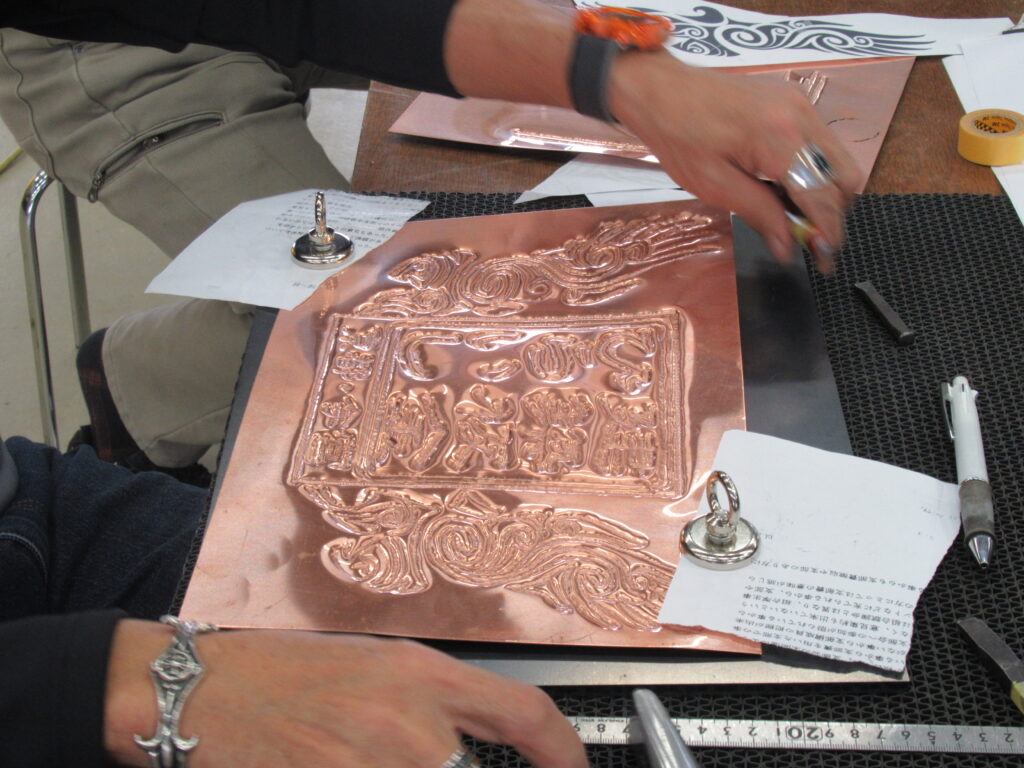 課題はたがね(鏨)を用いて金属の表面に模様や形状を彫り込み、または盛り上げることにより金属作品を作り上げる彫金であり、今回は建築板金で用いる銅を加工して仕上げました。